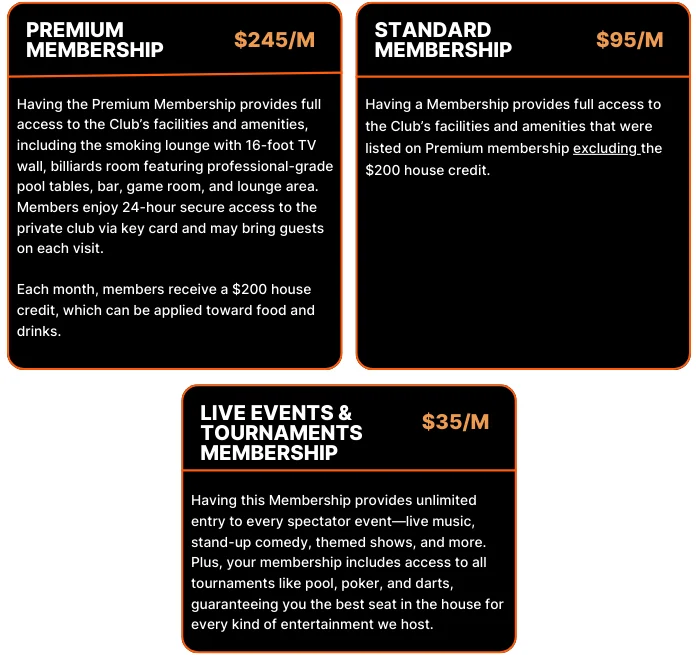 Unlock unlimited entry to every spectator event—live music, stand-up comedy, themed shows, and more. Plus, your membership includes access to all tournaments like pool, poker, and darts, guaranteeing you the best seat in the house for every kind of entertainment we host.